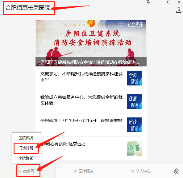 門診排班早知道。為了便捷就醫(yī),我院微信服務(wù)號(hào)門診排班界面可以查詢到門診排班表。