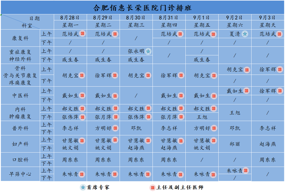 為方便廣大市民了解合肥佰惠長榮醫(yī)院門診醫(yī)師出診安排,現(xiàn)發(fā)布下周(8月28日-9月3日)門診醫(yī)師排班表,請大家合理安排就診時間。如遇停診、換診等特殊情況有所調(diào)整,以當日出診安排為準,造成不便敬請諒解!