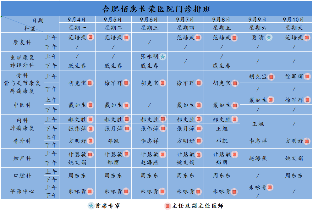 為方便廣大市民了解合肥佰惠長(zhǎng)榮醫(yī)院門(mén)診醫(yī)師出診安排,現(xiàn)發(fā)布下周(9月4日-9月10日)門(mén)診醫(yī)師排班表,請(qǐng)大家合理安排就診時(shí)間。如遇停診、換診等特殊情況有所調(diào)整,以當(dāng)日出診安排為準(zhǔn),造成不便敬請(qǐng)諒解!