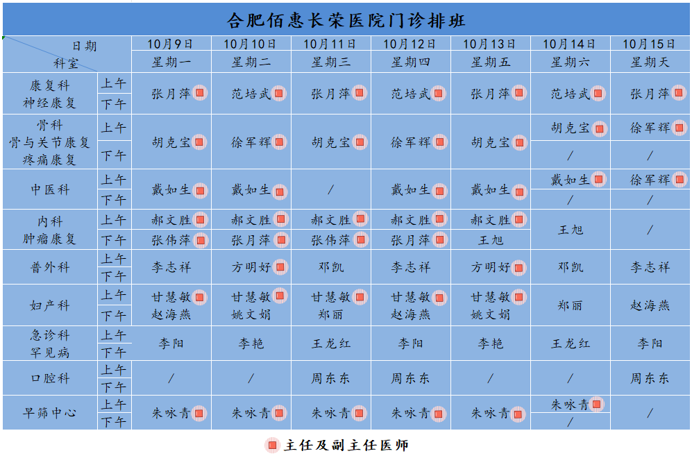 為方便廣大市民了解合肥佰惠長榮醫(yī)院門診醫(yī)師出診安排,現(xiàn)發(fā)布下周(10月9日-10月15日)門診醫(yī)師排班表,請大家合理安排就診時間。如遇停診、換診等特殊情況有所調(diào)整,以當(dāng)日出診安排為準(zhǔn),造成不便敬請諒解!