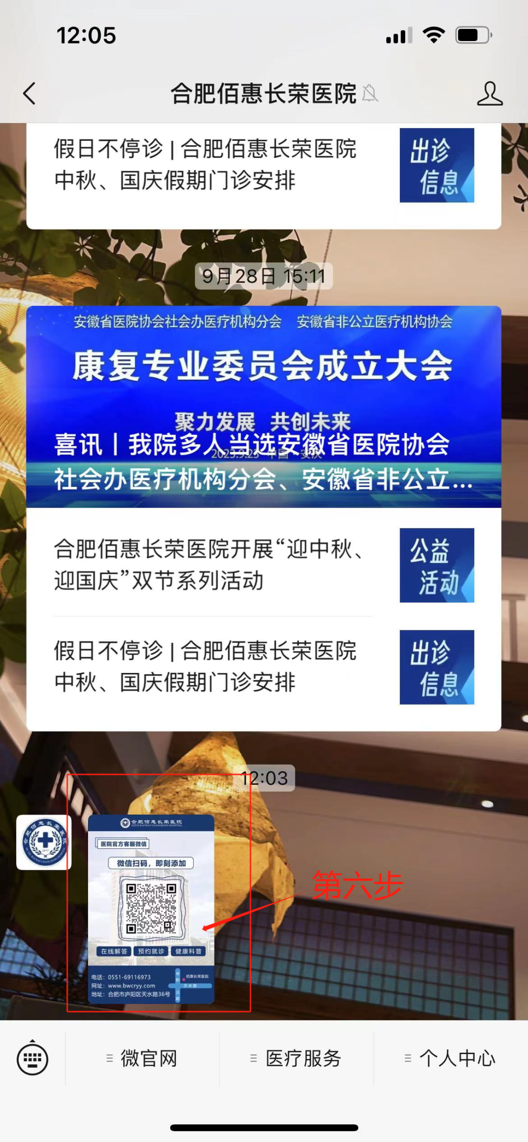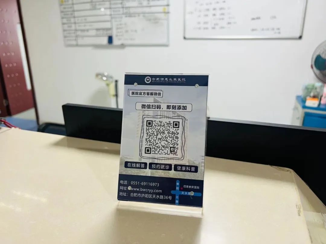 ②方式二:微信搜索“合肥佰惠長(zhǎng)榮醫(yī)院”公眾號(hào)→【點(diǎn)擊關(guān)注進(jìn)入首頁(yè)】→【點(diǎn)擊“微官網(wǎng)”,再點(diǎn)擊“就診咨詢”】→【點(diǎn)開圖片,長(zhǎng)按圖片識(shí)別二維碼】添加到微信通訊錄即可。③方式三:合肥佰惠長(zhǎng)榮醫(yī)院院內(nèi)各處擺放的“佰惠健康管家”臺(tái)卡目前,我院已將“佰惠健康管家”微信二維碼的臺(tái)卡放置在了患者服務(wù)中心、門診、體檢中心、內(nèi)鏡中心、各病區(qū)護(hù)士站等地。大家可直接“微信掃描二維碼”進(jìn)行添加。