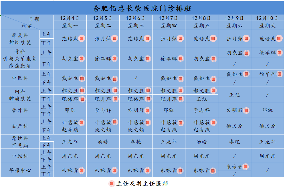 為方便廣大市民了解合肥佰惠長(zhǎng)榮醫(yī)院門診醫(yī)師出診安排,現(xiàn)發(fā)布下周(12月4日-12月10日)門診醫(yī)師排班表,請(qǐng)大家合理安排就診時(shí)間。如遇停診、換診等特殊情況有所調(diào)整,以當(dāng)日出診安排為準(zhǔn),造成不便敬請(qǐng)諒解!