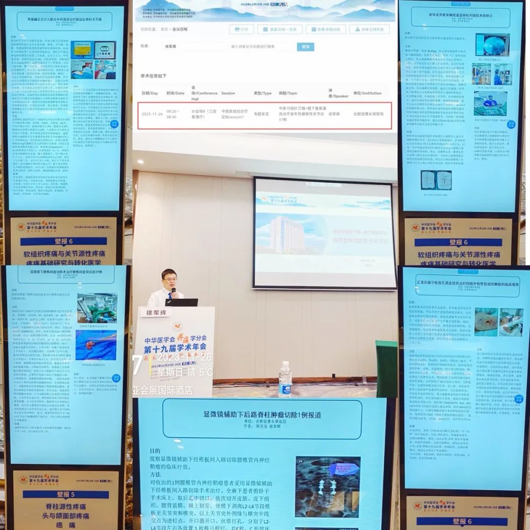 備受關(guān)注的是,此次年會安徽省共投稿11篇論文,而由我院骨科/骨科康復(fù)胡克寶主任和徐軍輝副主任醫(yī)師投稿的6篇論文全數(shù)被錄用。其中《顯微鏡下腰椎間盤切除術(shù)治療腰椎間盤突出癥29例》、《初學(xué)者開展單側(cè)雙通道脊柱內(nèi)鏡技術(shù)的體會》、《顯微鏡輔助下后路脊柱腫瘤切除1例報道》、《青藤堿定點介入聯(lián)合中藥溻漬治療新冠后脊柱關(guān)節(jié)痛》、《正清風(fēng)痛寧電致孔透皮給藥治療四肢外傷性軟組織腫脹的臨床觀察》5篇論文被大會選為電子壁報展示,此外,《中醫(yī)可視針刀鏡+鏡下臭氧灌洗治療老年性膝骨性關(guān)節(jié)炎》論文則由合肥佰惠長榮醫(yī)院骨科/骨科康復(fù)副主任醫(yī)師徐軍輝(論文作者)在會上進行專題學(xué)術(shù)報告,其精彩演講引起了與會人員的熱烈反響,并受到了高度贊賞。