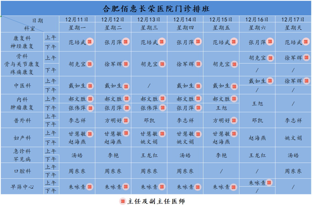 為方便廣大市民了解合肥佰惠長榮醫(yī)院門診醫(yī)師出診安排,現發(fā)布下周(12月11日-12月17日)門診醫(yī)師排班表,請大家合理安排就診時間。如遇停診、換診等特殊情況有所調整,以當日出診安排為準,造成不便敬請諒解!