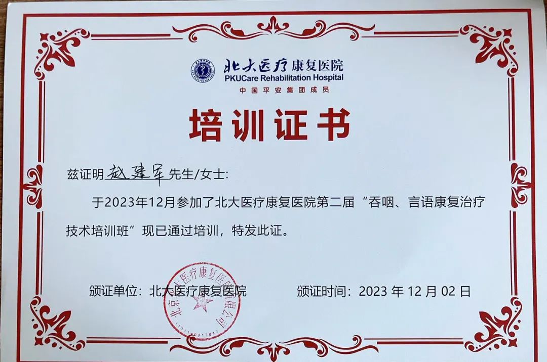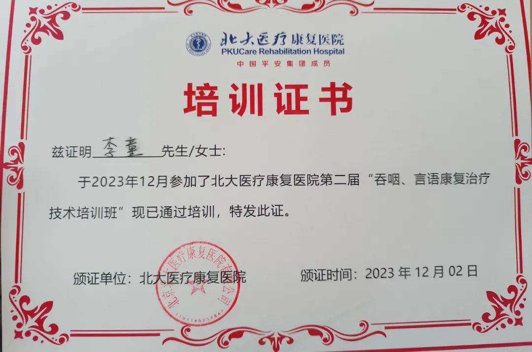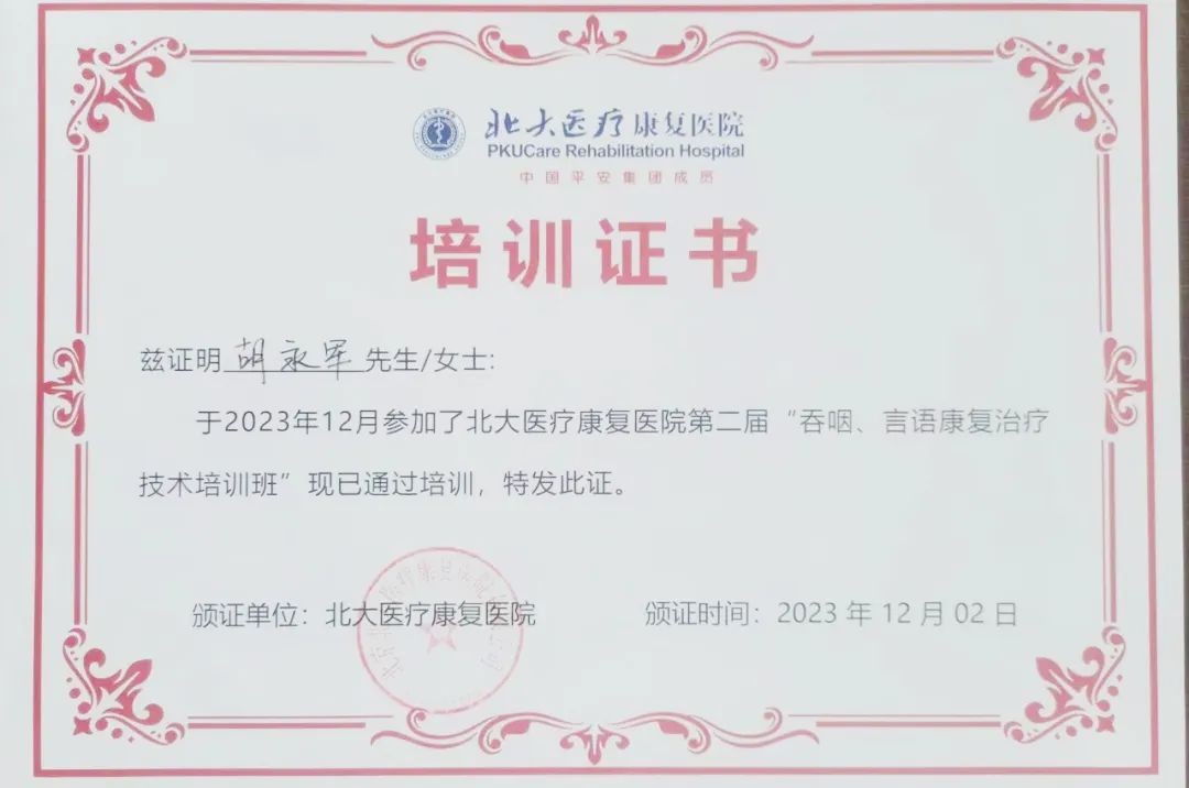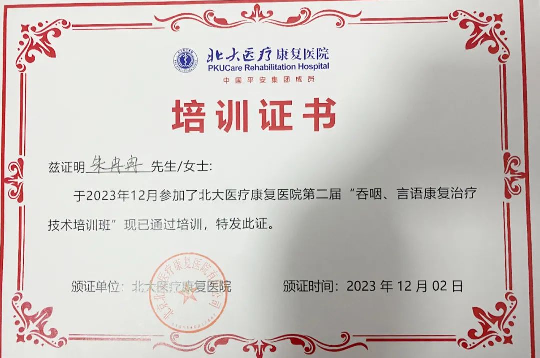 2023年12月01日-02日,合肥佰惠長榮醫(yī)院神經(jīng)康復科胡永軍和趙建軍醫(yī)生以及康復治療師李童、朱冉冉參加了由北大醫(yī)療康復醫(yī)院舉辦的第二屆“吞咽、言語康復治療技術培訓班”,期間他們積極參與學習,并成功獲得培訓證書。這一成果的取得不僅展示了我院醫(yī)療團隊的專業(yè)能力和學習態(tài)度,也將為患者提供更加專業(yè)、全面的康復服務。