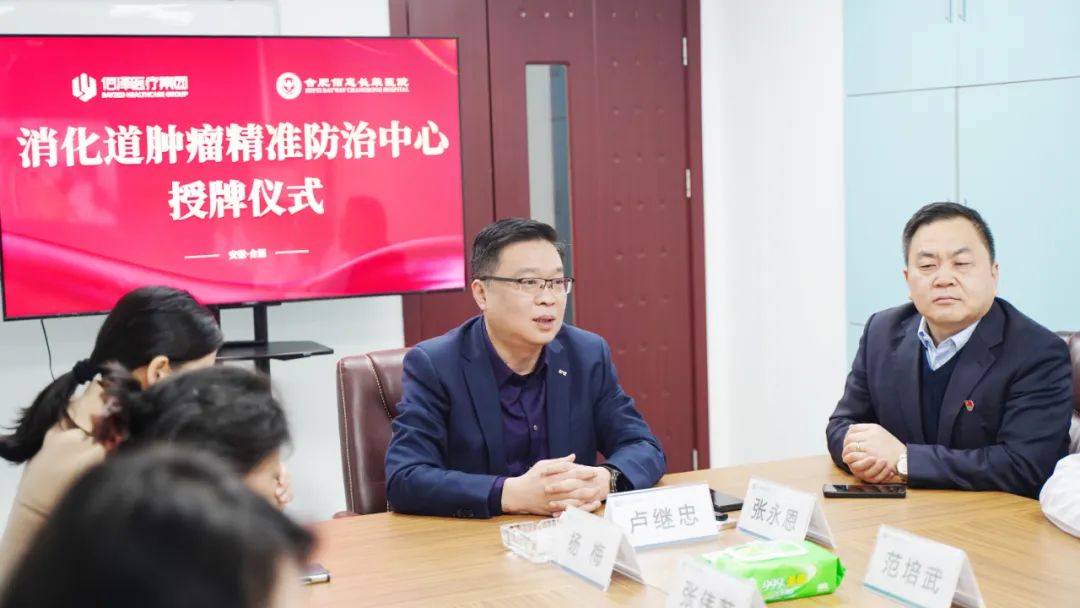 為推動(dòng)健康中國(guó)2030行動(dòng),在貫徹佰澤醫(yī)療集團(tuán)“腫瘤全周期”戰(zhàn)略方針的基礎(chǔ)上,促進(jìn)腫瘤精準(zhǔn)防治的普及和發(fā)展,以滿足患者的全方位醫(yī)療需求,2023年12月27日上午,合肥佰惠長(zhǎng)榮醫(yī)院“消化道腫瘤精準(zhǔn)防治中心”正式授牌成立。佰澤醫(yī)療集團(tuán)副總裁、合肥佰惠長(zhǎng)榮醫(yī)院院長(zhǎng)盧繼忠,佰澤醫(yī)療集團(tuán)創(chuàng)新發(fā)展部總經(jīng)理姜錚、合肥佰惠長(zhǎng)榮醫(yī)院院領(lǐng)導(dǎo)班子及相關(guān)科室人員出席了授牌儀式。授牌儀式由我院業(yè)務(wù)副院長(zhǎng)張偉萍主持。會(huì)上,佰澤醫(yī)療集團(tuán)創(chuàng)新發(fā)展部總經(jīng)理姜錚通過(guò)視頻會(huì)議對(duì)我院消化道腫瘤防治中心授牌成立表示祝賀。他強(qiáng)調(diào)佰澤醫(yī)療集團(tuán)一直致力于打造中國(guó)領(lǐng)先的腫瘤全周期醫(yī)療集團(tuán)。今年一季度,集團(tuán)在河南武陟濟(jì)民醫(yī)院?jiǎn)?dòng)了消化道腫瘤精準(zhǔn)防治中心的試點(diǎn)工作,并已初步建立了一套精準(zhǔn)防治體系。此次合肥佰惠長(zhǎng)榮醫(yī)院消化道腫瘤精準(zhǔn)防治中心的正式掛牌運(yùn)營(yíng),既是對(duì)上一階段工作的總結(jié)和肯定,也是集團(tuán)在安徽地區(qū)落實(shí)腫瘤全周期布局、實(shí)施腫瘤精準(zhǔn)防治的重要一環(huán)。他希望中心在盧總的領(lǐng)導(dǎo)下,進(jìn)一步圍繞消化道腫瘤三大病種,不斷優(yōu)化中心的運(yùn)營(yíng)體系,與其他兄弟單位一起讓集團(tuán)在消化道腫瘤細(xì)分領(lǐng)域中繼續(xù)保持領(lǐng)先地位,使更多患者受益。
