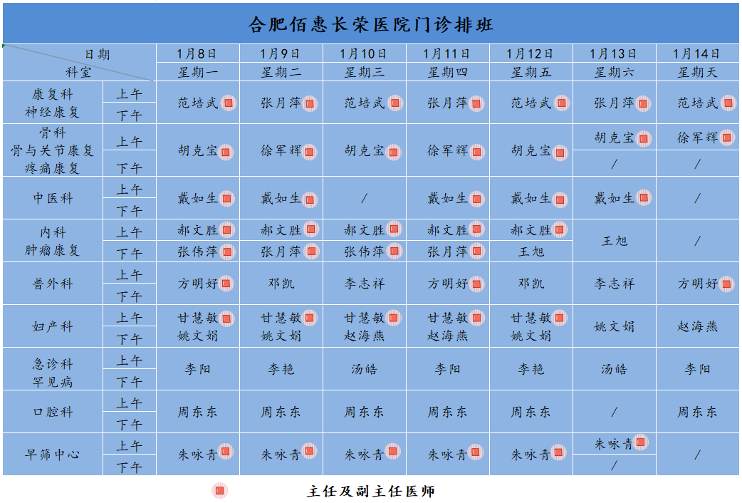 為方便廣大市民了解合肥佰惠長(zhǎng)榮醫(yī)院門診醫(yī)師出診安排,現(xiàn)發(fā)布下周(1月8日-1月14日)門診醫(yī)師排班表,請(qǐng)大家合理安排就診時(shí)間。如遇停診、換診等特殊情況有所調(diào)整,以當(dāng)日出診安排為準(zhǔn),造成不便敬請(qǐng)諒解!