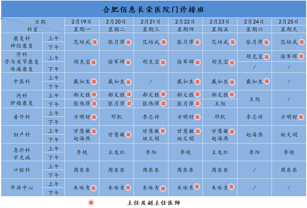 為方便廣大市民了解合肥佰惠長榮醫(yī)院門診醫(yī)師出診安排,現(xiàn)發(fā)布下周(2月19日-2月25日)門診醫(yī)師排班表,請大家合理安排就診時間。如遇停診、換診等特殊情況有所調(diào)整,以當(dāng)日出診安排為準(zhǔn),造成不便敬請諒解!