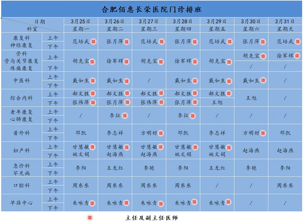 為方便廣大市民了解合肥佰惠長榮醫(yī)院門診醫(yī)師出診安排,現(xiàn)發(fā)布下周(3月25日-3月31日)門診醫(yī)師排班表,請大家合理安排就診時間。如遇停診、換診等特殊情況有所調整,以當日出診安排為準,造成不便敬請諒解!