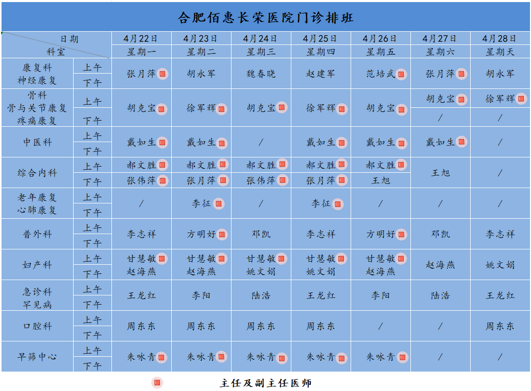 為方便廣大市民了解合肥佰惠長榮醫(yī)院門診醫(yī)師出診安排,現(xiàn)發(fā)布下周(4月22日-4月28日)門診醫(yī)師排班表,請大家合理安排就診時(shí)間。如遇停診、換診等特殊情況有所調(diào)整,以當(dāng)日出診安排為準(zhǔn),造成不便敬請諒解!