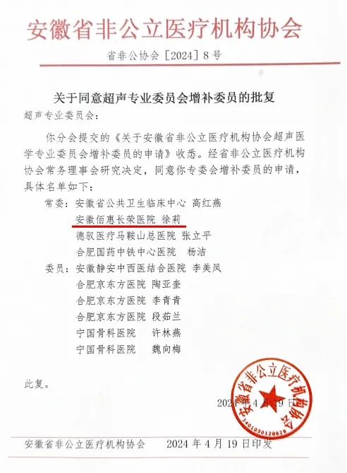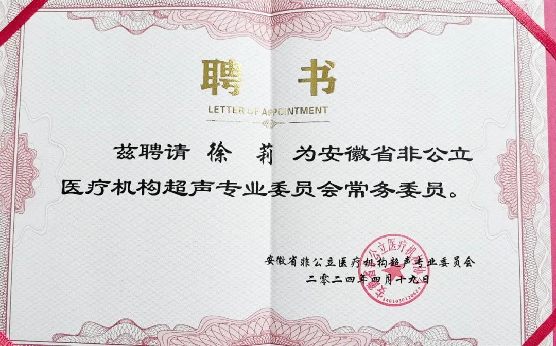 會(huì)議期間,宣布了增補(bǔ)安徽省非公立醫(yī)療機(jī)構(gòu)超聲專業(yè)委員會(huì)常委及委員的相關(guān)批復(fù)。通過評(píng)選,合肥佰惠長(zhǎng)榮醫(yī)院功能科主任徐莉當(dāng)選安徽省非公立醫(yī)療機(jī)構(gòu)超聲專業(yè)委員會(huì)常務(wù)委員!