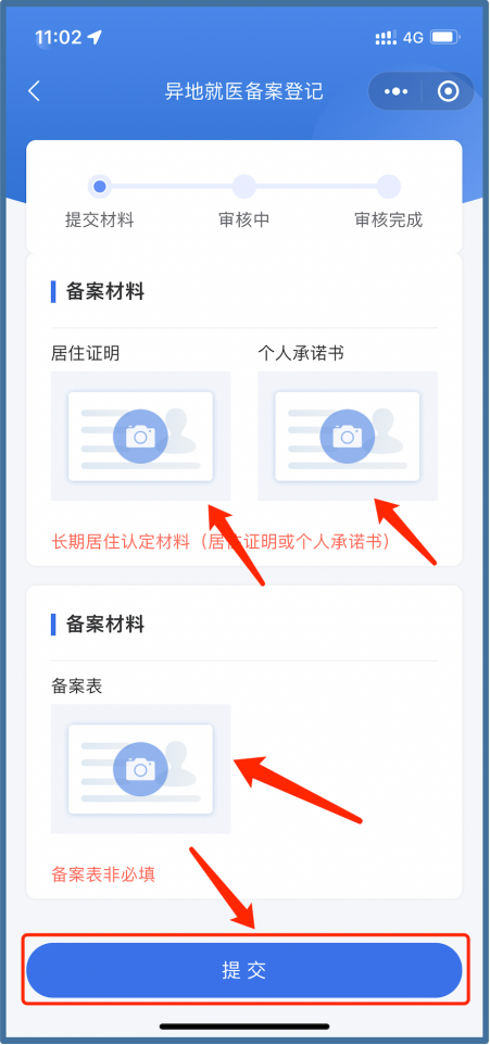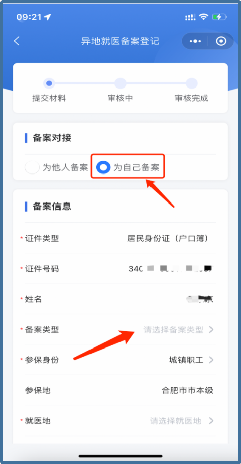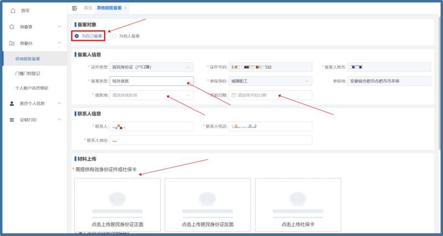 在界面上勾選【為自己備案】,選擇【備案類(lèi)型】、就醫(yī)地、開(kāi)始日期,填寫(xiě)聯(lián)系人電話、聯(lián)系人地址等信息,按界面顯示所需的材料清單,上傳電子材料(手機(jī)等拍照的jpg格式照片即可),填寫(xiě)完成并核對(duì)無(wú)誤后,點(diǎn)擊【提交】,完成備案。