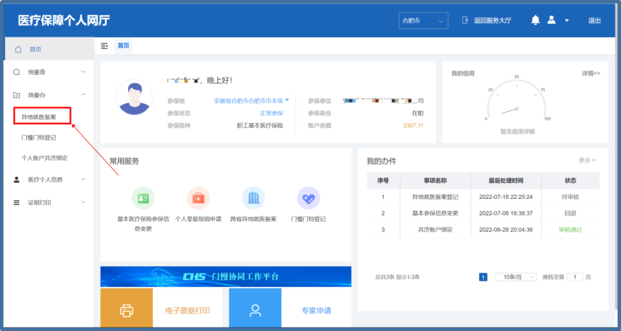第一步:在電腦PC瀏覽器以“個(gè)人登錄”的方式,登錄“安徽醫(yī)保公共服務(wù)網(wǎng)上服務(wù)大廳”,登錄成功以后,依次選擇左側(cè)“我要辦”-“異地就醫(yī)備案”。網(wǎng)址鏈接:https://ybj.ahzwfw.gov.cn/hsa-pss/hallEnter/?authCode=fb9be7d1-8f8b-4cd5-aa2f-78f409f0ec95#/Index