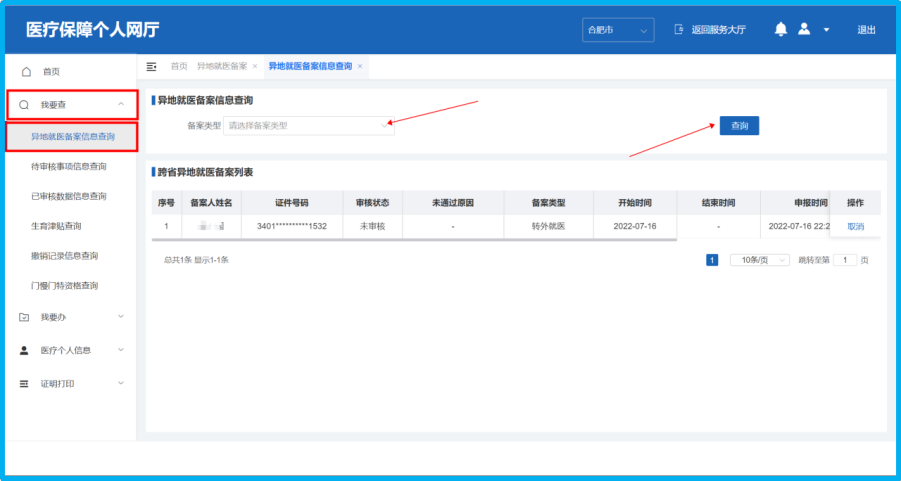 登錄“安徽醫(yī)保公共服務(wù)網(wǎng)上服務(wù)大廳”,登錄成功以后,依次選擇左側(cè)“我要查”-“異地就醫(yī)備案信息查詢(xún)”。