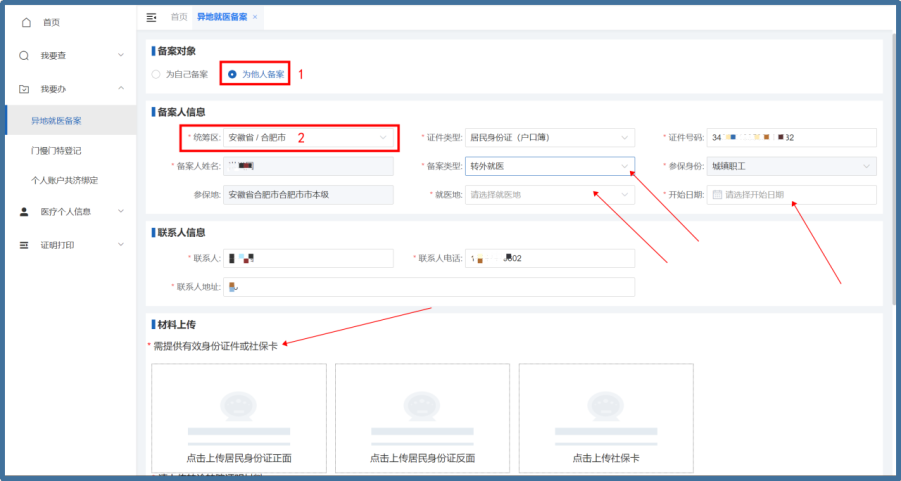 在界面上勾選【為他人備案】,選擇“他人”就醫(yī)人所在的【統(tǒng)籌區(qū)】、【證件類(lèi)型】,輸入就醫(yī)人的證件號(hào)碼,系統(tǒng)自動(dòng)查詢(xún)就醫(yī)人的參保信息,選擇備案類(lèi)型、就醫(yī)地、開(kāi)始日期,填寫(xiě)聯(lián)系人電話、聯(lián)系人地址等信息,按界面顯示所需的材料清單,上傳電子材料(手機(jī)等拍照的jpg格式照片即可),填寫(xiě)完成并核對(duì)無(wú)誤后,點(diǎn)擊【提交】,完成備案。
