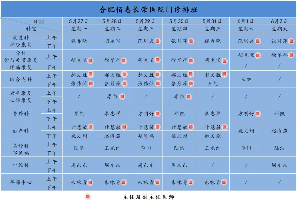 為方便廣大市民了解合肥佰惠長榮醫(yī)院門診醫(yī)師出診安排,現(xiàn)發(fā)布下周(5月27日-6月2日)門診醫(yī)師排班表,請大家合理安排就診時間。如遇停診、換診等特殊情況有所調(diào)整,以當(dāng)日出診安排為準,造成不便敬請諒解!