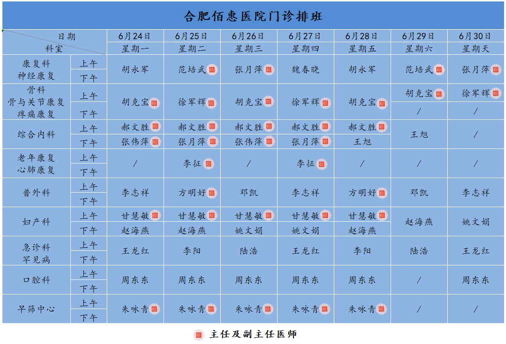為方便廣大市民了解合肥佰惠醫(yī)院門診醫(yī)師出診安排,現(xiàn)發(fā)布下周(6月24日-6月30日)門診醫(yī)師排班表,請大家合理安排就診時間。如遇停診、換診等特殊情況有所調整,以當日出診安排為準,造成不便敬請諒解!