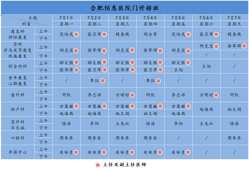 為方便廣大市民了解合肥佰惠醫(yī)院門診醫(yī)師出診安排,現(xiàn)發(fā)布下周(7月1日-7月7日)門診醫(yī)師排班表,請(qǐng)大家合理安排就診時(shí)間。如遇停診、換診等特殊情況有所調(diào)整,以當(dāng)日出診安排為準(zhǔn),造成不便敬請(qǐng)諒解!