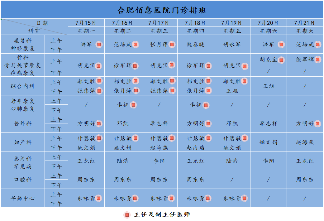 為方便廣大市民了解合肥佰惠醫(yī)院門診醫(yī)師出診安排,現(xiàn)發(fā)布下周(7月15日-7月21日)門診醫(yī)師排班表,請大家合理安排就診時(shí)間。如遇停診、換診等特殊情況有所調(diào)整,以當(dāng)日出診安排為準(zhǔn),造成不便敬請諒解!