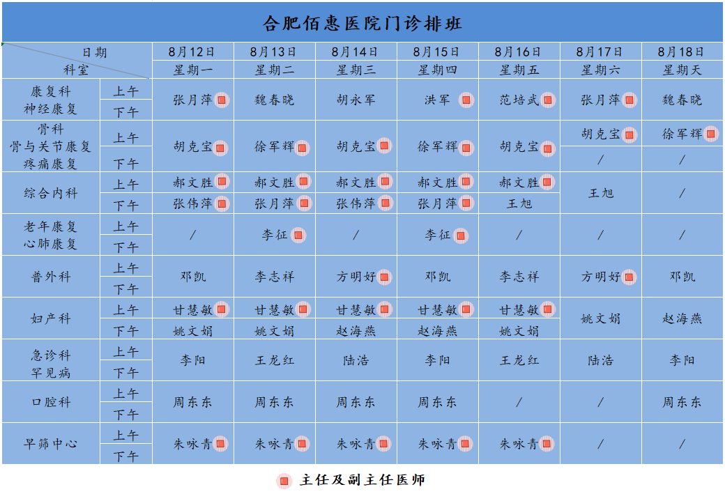 為方便廣大市民了解合肥佰惠醫(yī)院門診醫(yī)師出診安排,現(xiàn)發(fā)布下周(8月12日-8月18日)門診醫(yī)師排班表,請大家合理安排就診時間。如遇停診、換診等特殊情況有所調(diào)整,以當日出診安排為準,造成不便敬請諒解!
