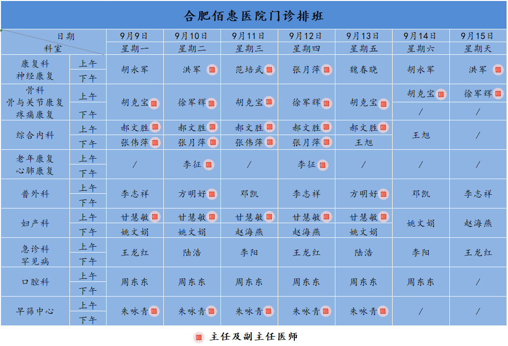 為方便廣大市民了解合肥佰惠醫(yī)院門診醫(yī)師出診安排,現(xiàn)發(fā)布下周(9月9日-9月15日)門診醫(yī)師排班表,請大家合理安排就診時間。如遇停診、換診等特殊情況有所調(diào)整,以當(dāng)日出診安排為準(zhǔn),造成不便敬請諒解!