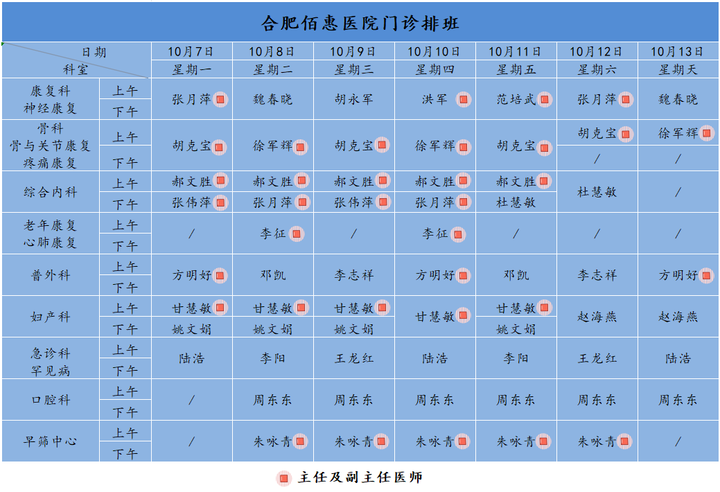 為方便廣大市民了解合肥佰惠醫(yī)院門診醫(yī)師出診安排,現(xiàn)發(fā)布下周(10月7日-10月13日)門診醫(yī)師排班表,請大家合理安排就診時間。如遇停診、換診等特殊情況有所調(diào)整,以當日出診安排為準,造成不便敬請諒解!