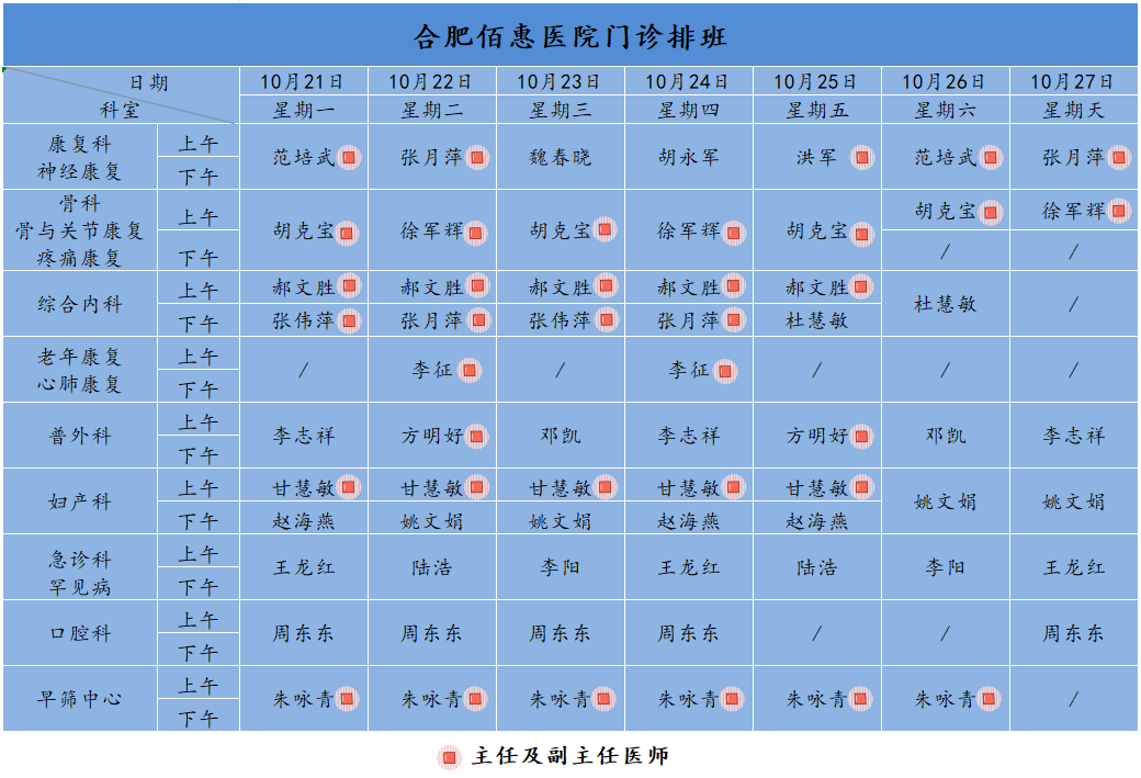 為方便廣大市民了解合肥佰惠醫(yī)院門診醫(yī)師出診安排,現(xiàn)發(fā)布下周(10月21日-10月27日)門診醫(yī)師排班表,請大家合理安排就診時間。如遇停診、換診等特殊情況有所調(diào)整,以當(dāng)日出診安排為準(zhǔn),造成不便敬請諒解!