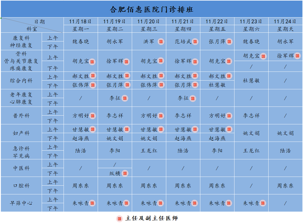為方便廣大市民了解合肥佰惠醫(yī)院門診醫(yī)師出診安排,現(xiàn)發(fā)布下周(11月18日-11月24日)門診醫(yī)師排班表,請大家合理安排就診時間。如遇停診、換診等特殊情況有所調(diào)整,以當(dāng)日出診安排為準(zhǔn),造成不便敬請諒解!