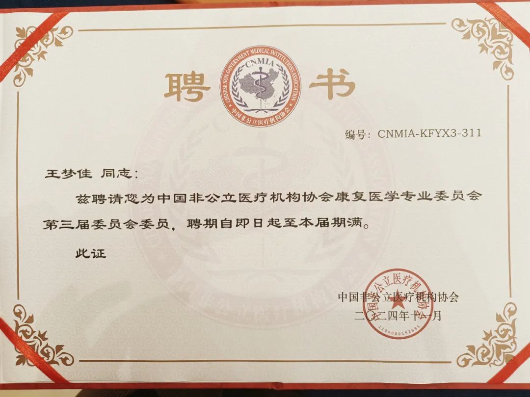 值得關(guān)注的是,在中國非公醫(yī)協(xié)康復(fù)醫(yī)學(xué)專委會三屆二次全體委員會議上,我院心肺康復(fù)科的王夢佳醫(yī)師被聘任為中國非公立醫(yī)療機構(gòu)協(xié)會康復(fù)醫(yī)學(xué)專業(yè)委員會第三屆委員會委員。此次任命,不僅是對個人專業(yè)能力的認可,也是我院在康復(fù)醫(yī)學(xué)領(lǐng)域不斷深耕、積極進取的成果體現(xiàn)。