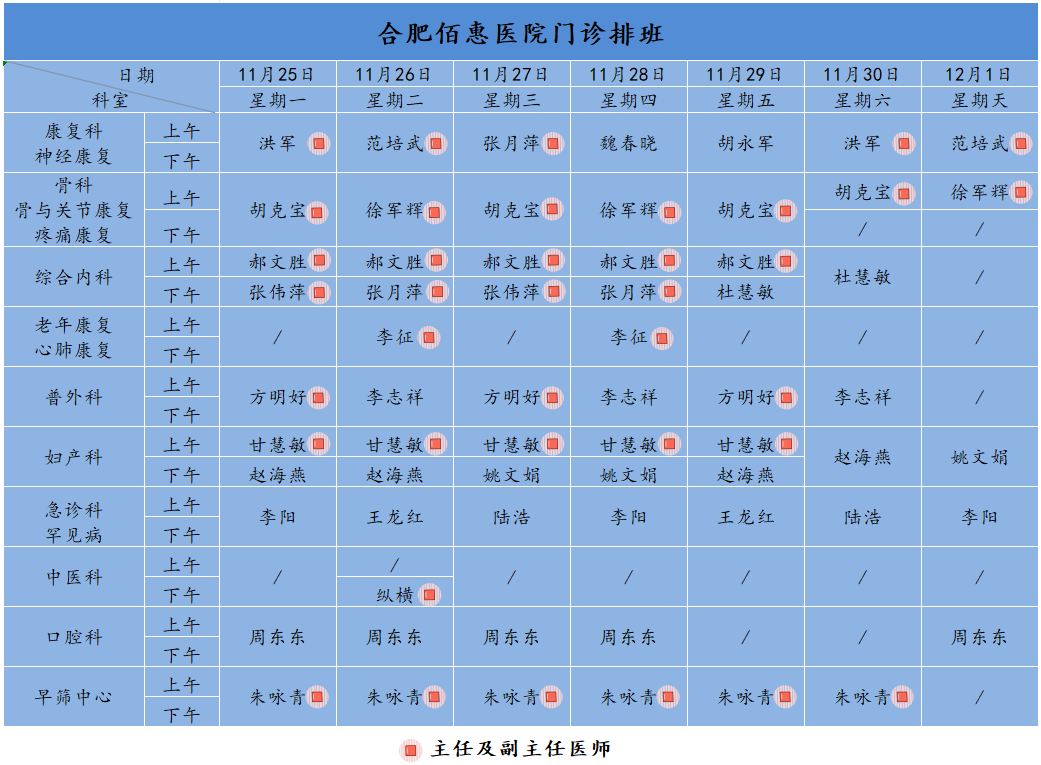為方便廣大市民了解合肥佰惠醫(yī)院門診醫(yī)師出診安排,現(xiàn)發(fā)布下周(11月25日-12月1日)門診醫(yī)師排班表,請(qǐng)大家合理安排就診時(shí)間。如遇停診、換診等特殊情況有所調(diào)整,以當(dāng)日出診安排為準(zhǔn),造成不便敬請(qǐng)諒解!