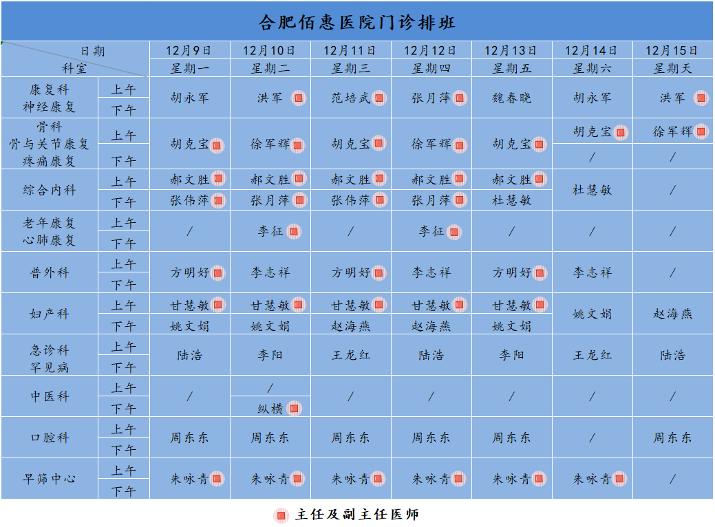 為方便廣大市民了解合肥佰惠醫(yī)院門診醫(yī)師出診安排,現(xiàn)發(fā)布下周(12月9日-12月15日)門診醫(yī)師排班表,請大家合理安排就診時(shí)間。如遇停診、換診等特殊情況有所調(diào)整,以當(dāng)日出診安排為準(zhǔn),造成不便敬請諒解!