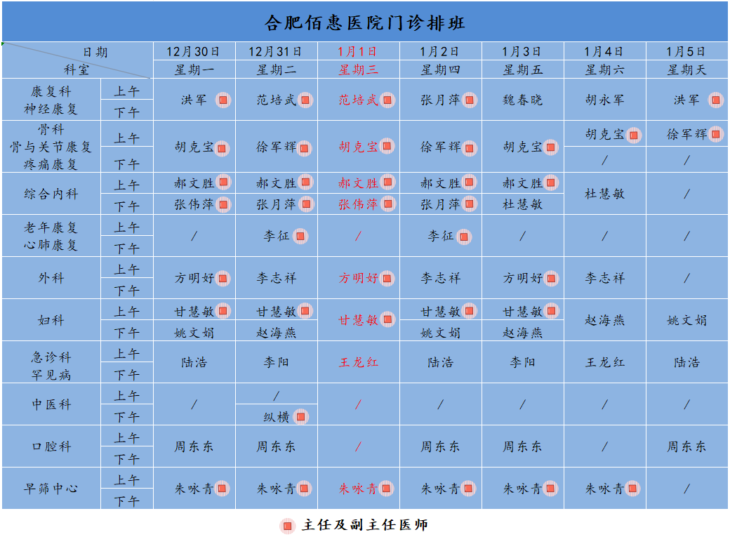 為方便廣大市民了解合肥佰惠醫(yī)院門(mén)診醫(yī)師出診安排,現(xiàn)發(fā)布下周(12月30日-1月5日)門(mén)診醫(yī)師排班表,請(qǐng)大家合理安排就診時(shí)間。如遇停診、換診等特殊情況有所調(diào)整,以當(dāng)日出診安排為準(zhǔn),造成不便敬請(qǐng)諒解!