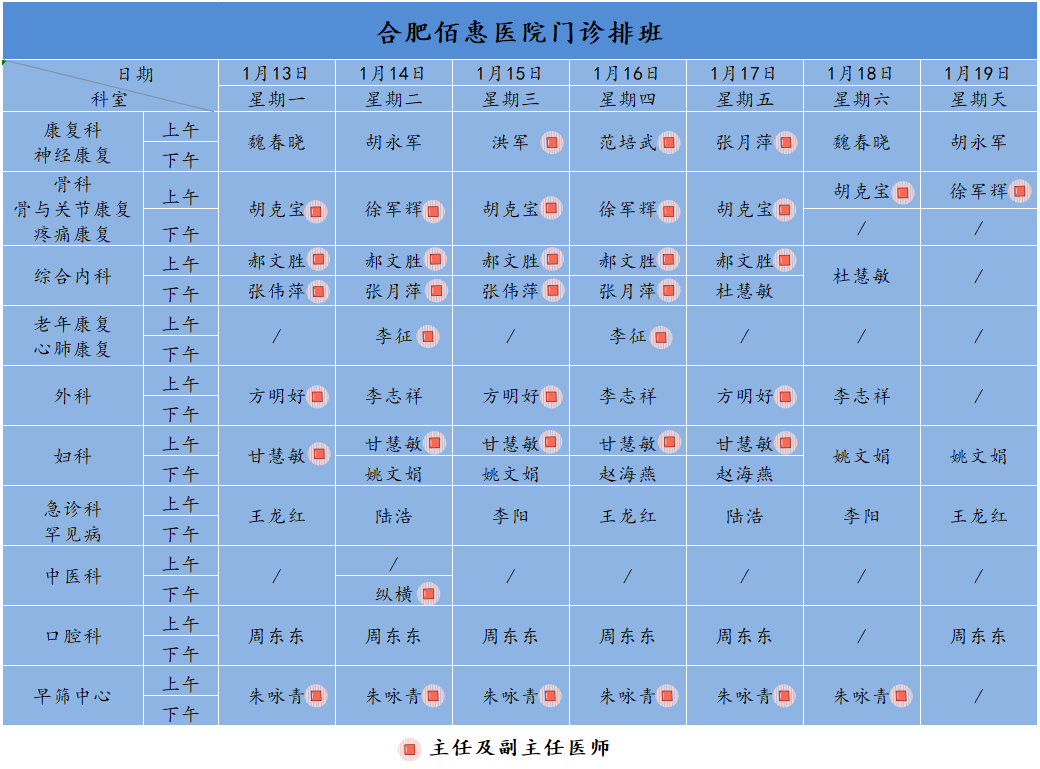 為方便廣大市民了解合肥佰惠醫(yī)院門診醫(yī)師出診安排,現(xiàn)發(fā)布下周(1月13日-1月19日)門診醫(yī)師排班表,請(qǐng)大家合理安排就診時(shí)間。如遇停診、換診等特殊情況有所調(diào)整,以當(dāng)日出診安排為準(zhǔn),造成不便敬請(qǐng)諒解!