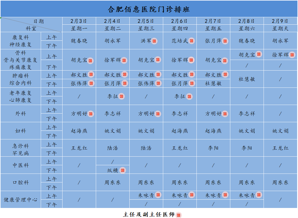 為方便廣大市民了解合肥佰惠醫(yī)院門診醫(yī)師出診安排,現(xiàn)發(fā)布下周(2月3日-2月9日)門診醫(yī)師排班表,請(qǐng)大家合理安排就診時(shí)間。如遇停診、換診等特殊情況有所調(diào)整,以當(dāng)日出診安排為準(zhǔn),造成不便敬請(qǐng)諒解!