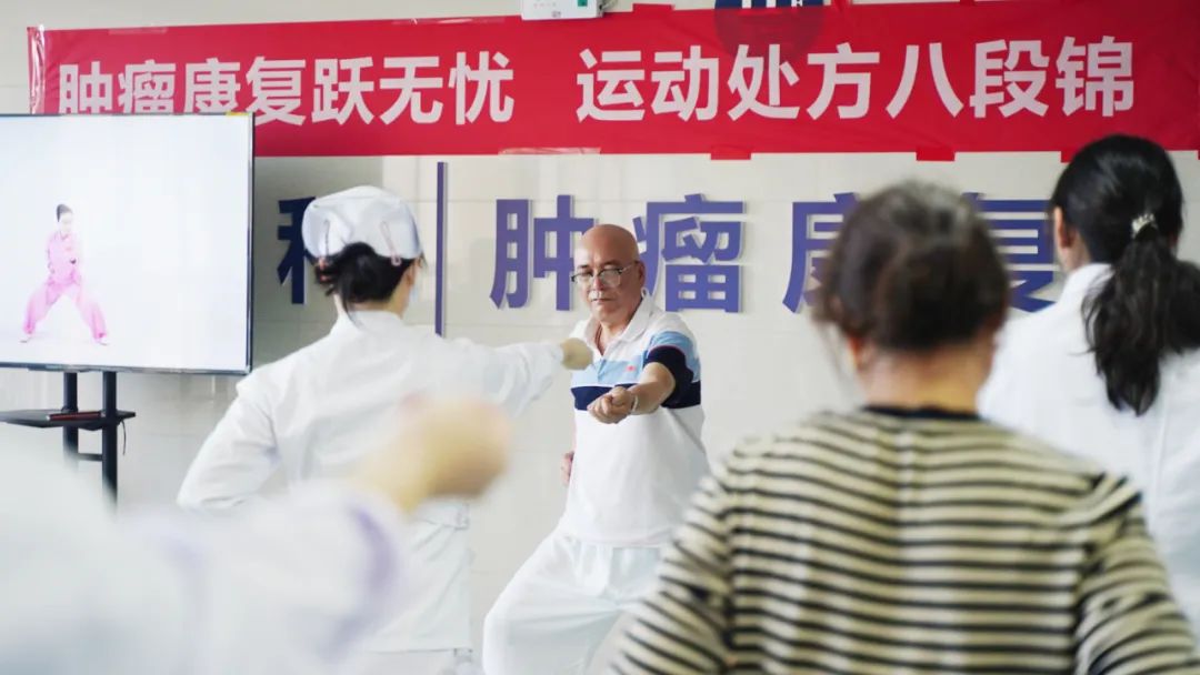 “健身氣功八段錦,預(yù)備式,左腳開步,與肩同寬,屈膝下蹲,掌抱腹前......”每天下午四點(diǎn)半,舒緩的音樂、清脆的口令就在病區(qū)準(zhǔn)時(shí)響起。醫(yī)護(hù)人員帶領(lǐng)患者、家屬及陪護(hù)人員,共同練習(xí)腫瘤康復(fù)運(yùn)動(dòng)處方——八段錦。大家表情淡定恬然,動(dòng)作協(xié)調(diào)有力,充滿美感,許多患者表示“一套八段錦練習(xí)下來,感覺周身輕松多了,連呼吸也更為順暢了”。