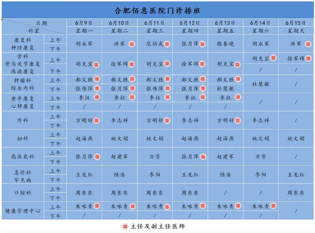 為方便廣大市民了解合肥佰惠醫(yī)院門診醫(yī)師出診安排,現(xiàn)發(fā)布下周(6月9日-6月15日)門診醫(yī)師排班表,請大家合理安排就診時(shí)間。如遇停診、換診等特殊情況有所調(diào)整,以當(dāng)日出診安排為準(zhǔn),造成不便敬請諒解!