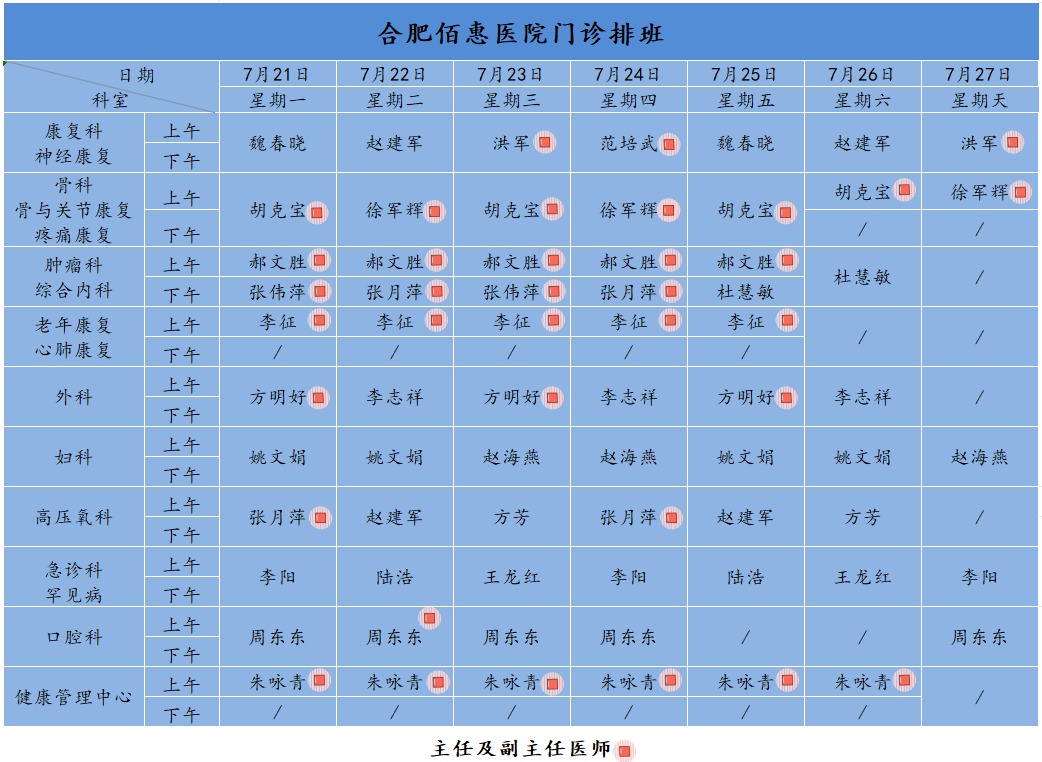 為方便廣大市民了解合肥佰惠醫(yī)院門診醫(yī)師出診安排,現(xiàn)發(fā)布本周(7月21日-7月27日)門診醫(yī)師排班表,請大家合理安排就診時間。如遇停診、換診等特殊情況有所調(diào)整,以當(dāng)日出診安排為準(zhǔn),造成不便敬請諒解!
