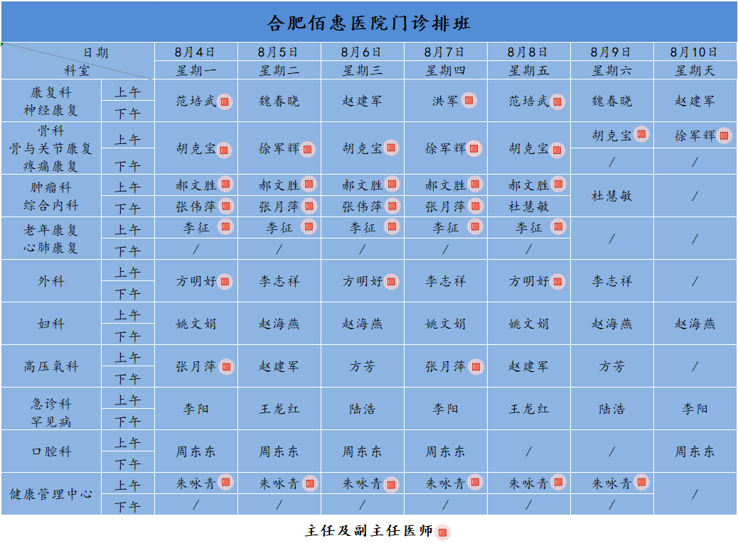 為方便廣大市民了解合肥佰惠醫(yī)院門診醫(yī)師出診安排,現(xiàn)發(fā)布本周(8月4日-8月10日)門診醫(yī)師排班表,請(qǐng)大家合理安排就診時(shí)間。如遇停診、換診等特殊情況有所調(diào)整,以當(dāng)日出診安排為準(zhǔn),造成不便敬請(qǐng)諒解!