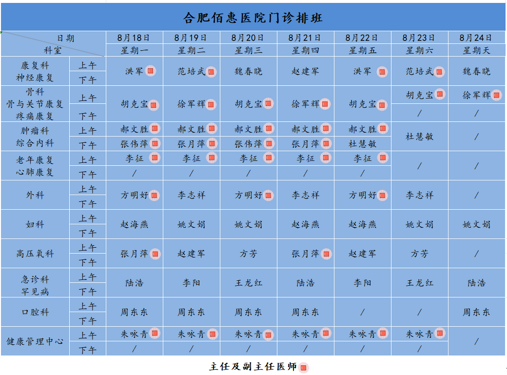 為方便廣大市民了解合肥佰惠醫(yī)院門診醫(yī)師出診安排,現(xiàn)發(fā)布本周(8月18日-8月24日)門診醫(yī)師排班表,請大家合理安排就診時間。如遇停診、換診等特殊情況有所調整,以當日出診安排為準,造成不便敬請諒解!