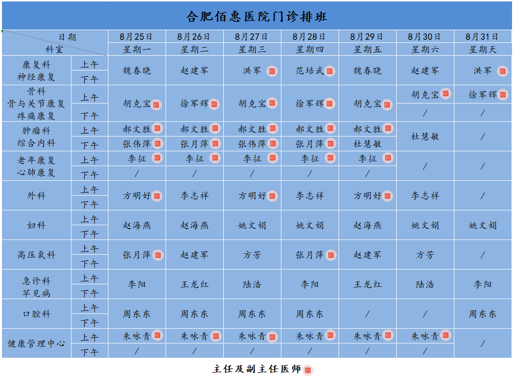 為方便廣大市民了解合肥佰惠醫(yī)院門診醫(yī)師出診安排,現(xiàn)發(fā)布本周(8月25日-8月31日)門診醫(yī)師排班表,請大家合理安排就診時(shí)間。如遇停診、換診等特殊情況有所調(diào)整,以當(dāng)日出診安排為準(zhǔn),造成不便敬請諒解!