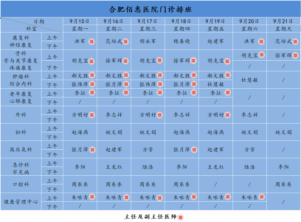 為方便廣大市民了解合肥佰惠醫(yī)院門(mén)診醫(yī)師出診安排,現(xiàn)發(fā)布本周(9月15日-9月21日)門(mén)診醫(yī)師排班表,請(qǐng)大家合理安排就診時(shí)間。如遇停診、換診等特殊情況有所調(diào)整,以當(dāng)日出診安排為準(zhǔn),造成不便敬請(qǐng)諒解!