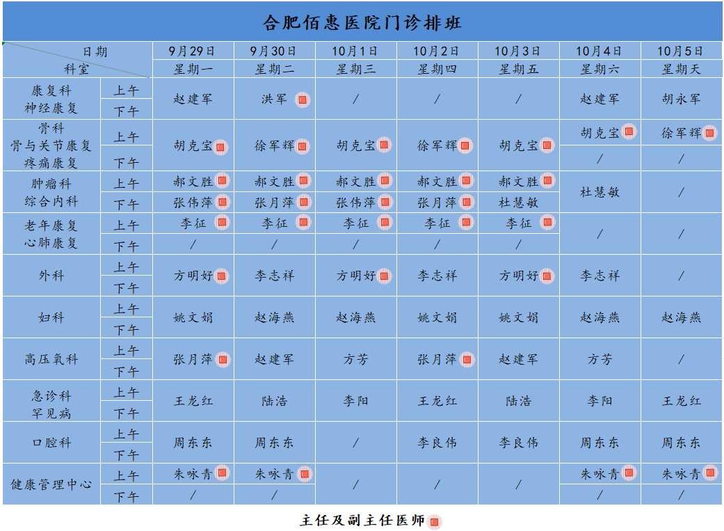 為方便廣大市民了解合肥佰惠醫(yī)院門診醫(yī)師出診安排,現(xiàn)發(fā)布本周(9月29日-10月5日)門診醫(yī)師排班表,請(qǐng)大家合理安排就診時(shí)間。如遇停診、換診等特殊情況有所調(diào)整,以當(dāng)日出診安排為準(zhǔn),造成不便敬請(qǐng)諒解!