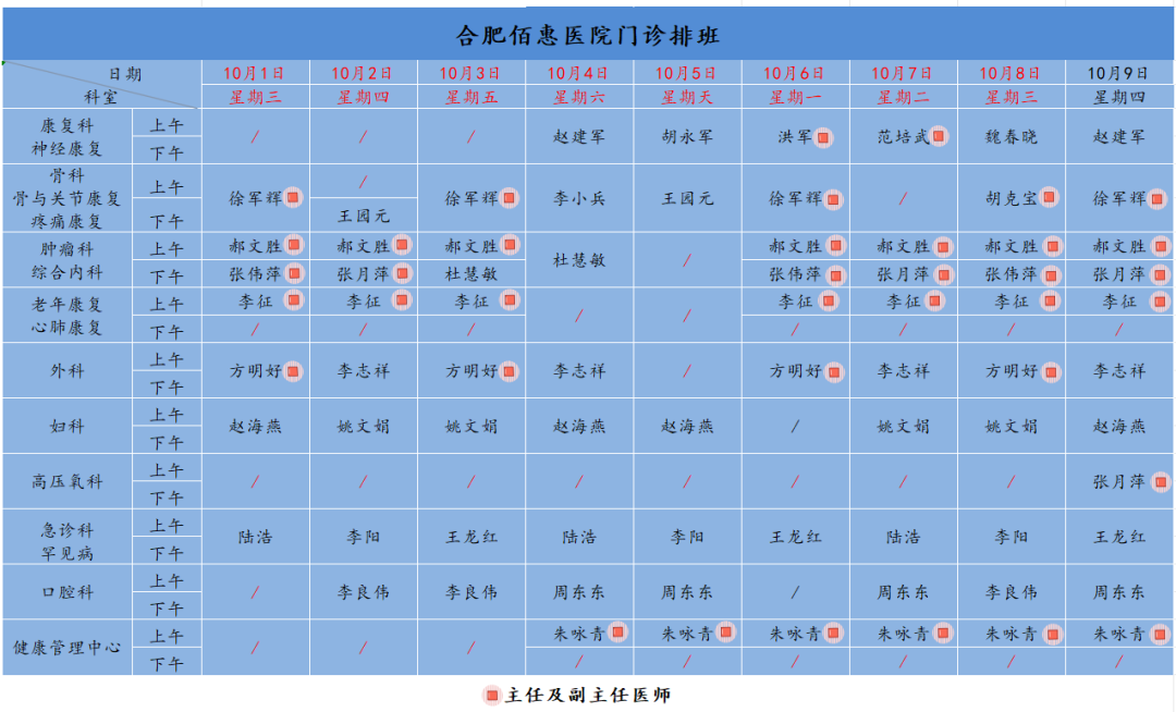 為方便廣大市民了解合肥佰惠醫(yī)院門診醫(yī)師出診安排,現(xiàn)發(fā)布國慶假期(10月1日-10月9日)門診醫(yī)師排班表,請大家合理安排就診時間。如遇停診、換診等特殊情況有所調(diào)整,以當(dāng)日出診安排為準(zhǔn),造成不便敬請諒解!
