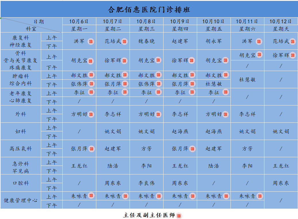 為方便廣大市民了解合肥佰惠醫(yī)院門診醫(yī)師出診安排,現(xiàn)發(fā)布本周(10月6日-10月12日)門診醫(yī)師排班表,請(qǐng)大家合理安排就診時(shí)間。如遇停診、換診等特殊情況有所調(diào)整,以當(dāng)日出診安排為準(zhǔn),造成不便敬請(qǐng)諒解!