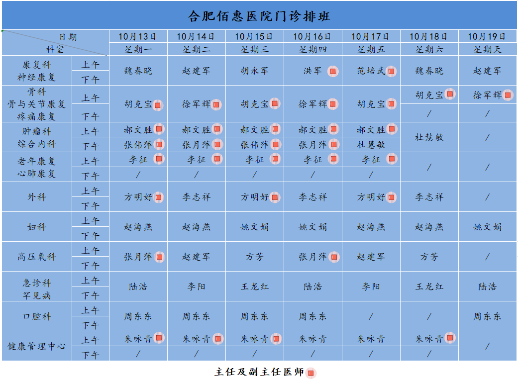 為方便廣大市民了解合肥佰惠醫(yī)院門診醫(yī)師出診安排,現(xiàn)發(fā)布本周(10月13日-10月19日)門診醫(yī)師排班表,請(qǐng)大家合理安排就診時(shí)間。如遇停診、換診等特殊情況有所調(diào)整,以當(dāng)日出診安排為準(zhǔn),造成不便敬請(qǐng)諒解!