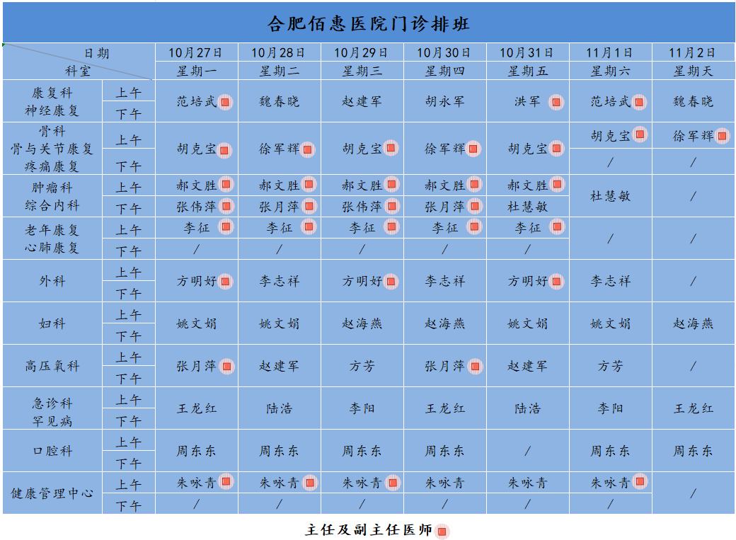 為方便廣大市民了解合肥佰惠醫(yī)院門診醫(yī)師出診安排,現(xiàn)發(fā)布本周(10月27日-11月2日)門診醫(yī)師排班表,請大家合理安排就診時間。如遇停診、換診等特殊情況有所調(diào)整,以當日出診安排為準,造成不便敬請諒解!
