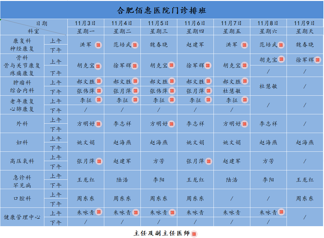 為方便廣大市民了解合肥佰惠醫(yī)院門診醫(yī)師出診安排,現(xiàn)發(fā)布本周(11月3日-11月9日)門診醫(yī)師排班表,請大家合理安排就診時間。如遇停診、換診等特殊情況有所調(diào)整,以當(dāng)日出診安排為準(zhǔn),造成不便敬請諒解!