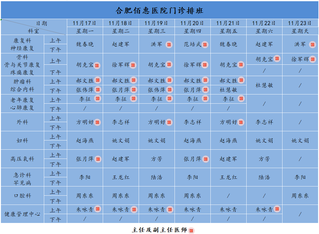 為方便廣大市民了解合肥佰惠醫(yī)院門診醫(yī)師出診安排,現(xiàn)發(fā)布本周(11月17日-11月23日)門診醫(yī)師排班表,請大家合理安排就診時間。如遇停診、換診等特殊情況有所調(diào)整,以當(dāng)日出診安排為準(zhǔn),造成不便敬請諒解!